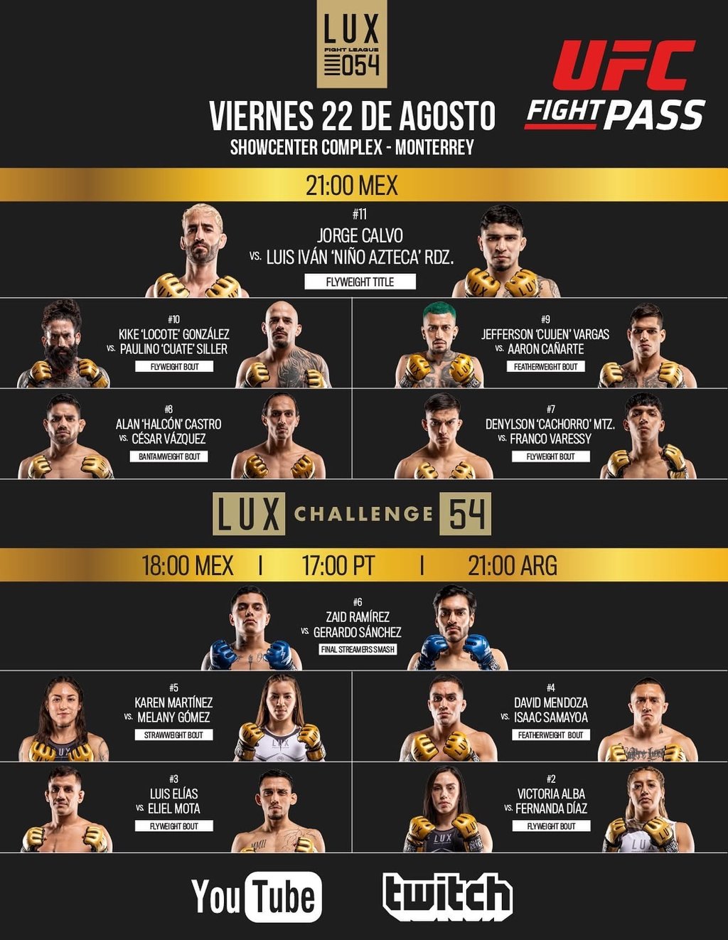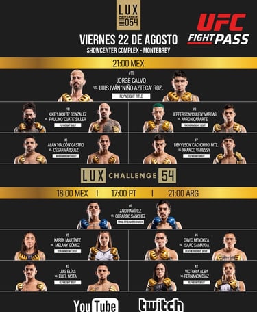 Con campeones consolidados, promesas encendidas y una producción de primer nivel, LUX 054 no es solo un evento… es una declaración de poder latinoamericano en las MMA.